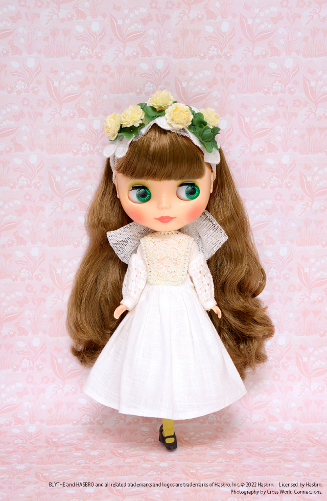 お洋服はホワイトのワンピースにエプロンワンピースを重ね、クローバーのお花を飾ったヘッドアクセサリーをコーディネートしています。