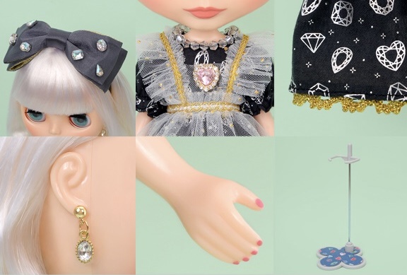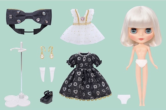 ドール、ワンピース、エプロン、ヘアバンド、ショーツ、ソックス、シューズ、ピアス、スタンド(腰支え)