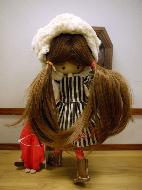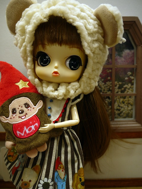 Byul ビョル/エリスのヌードドールにネオブライスサイズのジュニームーン森の仲間たちがプリントされたワンピース、森の小人モンチッチ(プチパース)をセットにしました。
