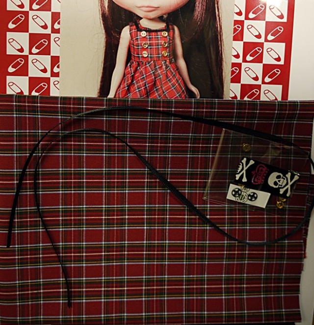 セット内容:タータンチェック生地、接着芯、サテンリボン、スナップ、メッキボタン、